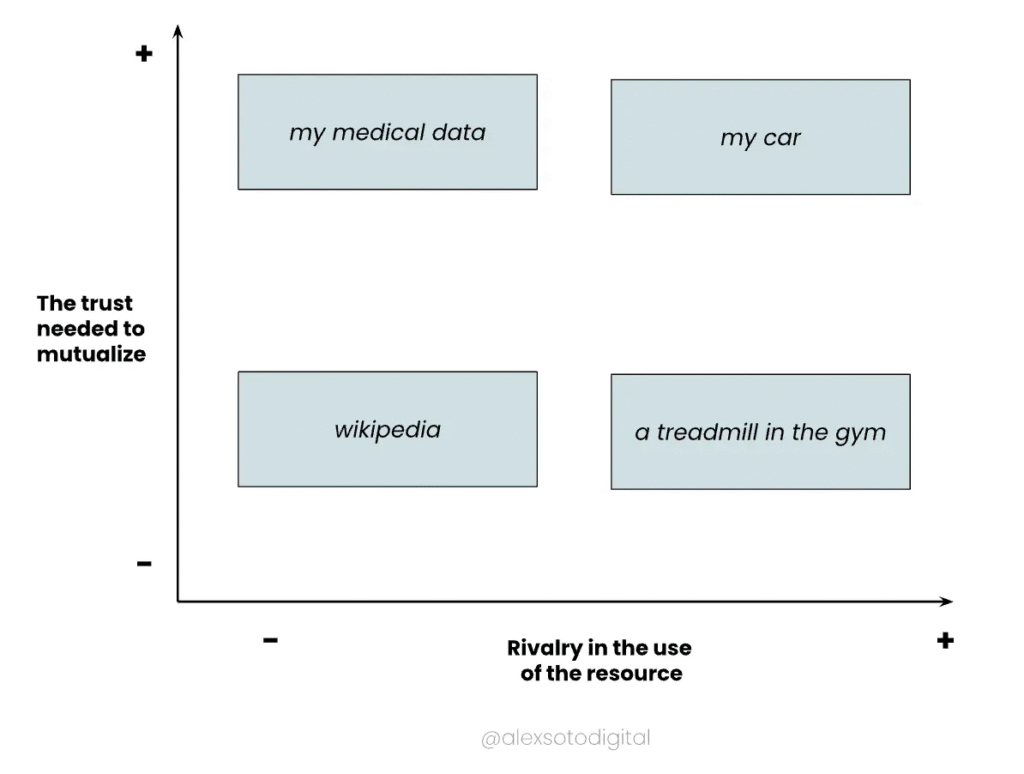 In other words, the level of mutualization depends on the type of asset and the level of trust required to share that type of asset with another unknown person.