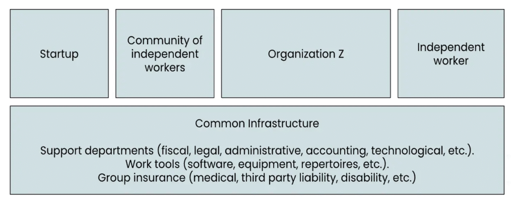 Imagine a base infrastructure focused on self-employed workers (independents, freelancers, gig workers), either individually or by forming collectives and work teams based on the projects that they are operating at that time.