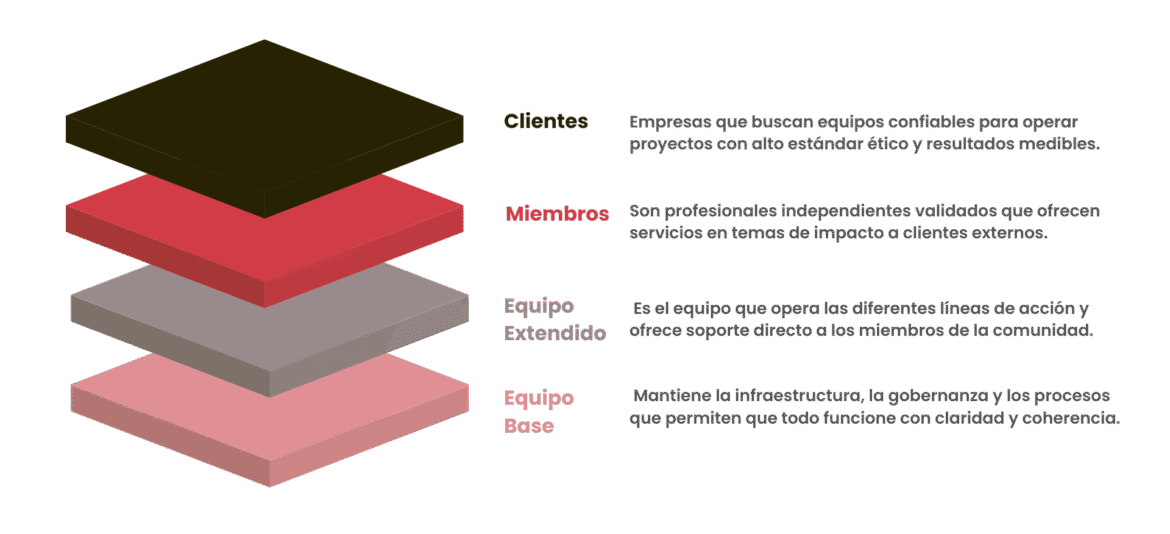 Nuestra estructura parte de una idea simple pero poderosa: cada nivel sostiene al siguiente, formando una cadena de cuidado y soporte que conecta al equipo base con los clientes finales.